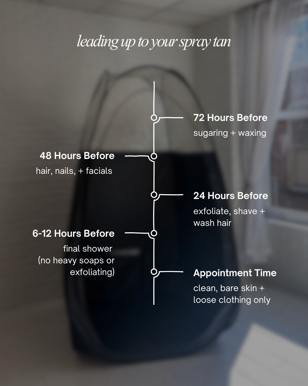 Use this timeline as a simple guide leading up to your appointment to avoid common mistakes and get the most out of your spray tan.